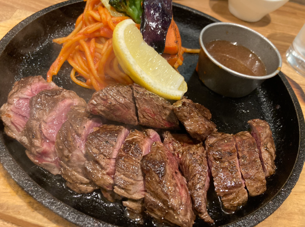 アウトサイドステーキやアメリカンステーキ、ハンキングテンダー、ラム肩ロース、黒毛和牛ステーキ等がメニューにありました。
